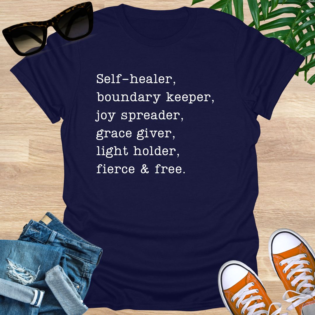For the woman rewriting her story one boundary, breath, and bold move at a time. This tee is for the self-healer, the joy spreader, the grace giver who holds light even in the darkest moments. Fierce. Free. Fully herself.